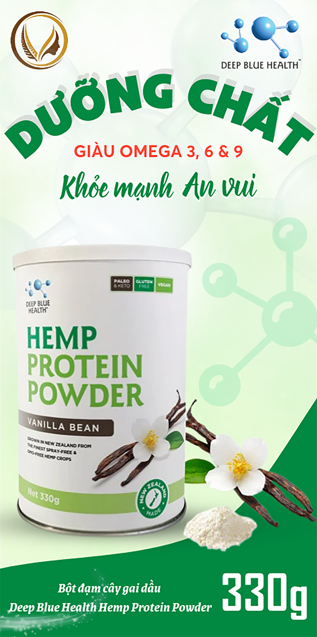 Deep Blue Health Hemp Protein Powder một siêu thực phẩm bền vững giàu axit béo Omega 3, 6 & 9, vitamin và khoáng chất quan trọng. Nó không chỉ hỗ trợ cân bằng lượng protein trong chế độ ăn uống, mà còn gia tăng cung cấp chất xơ.
