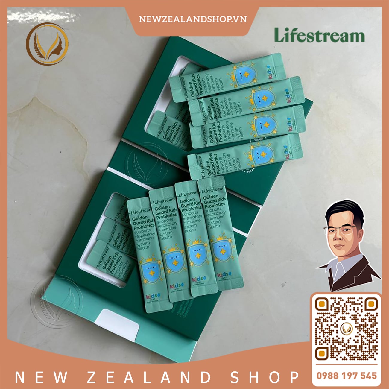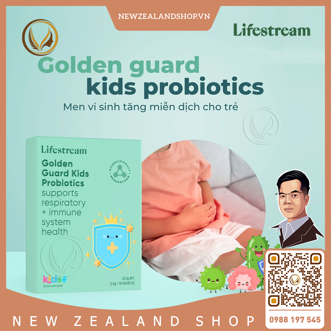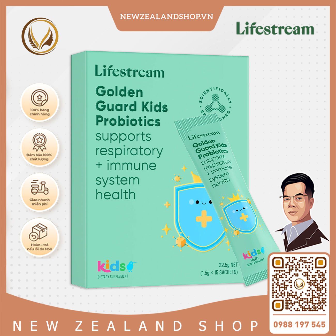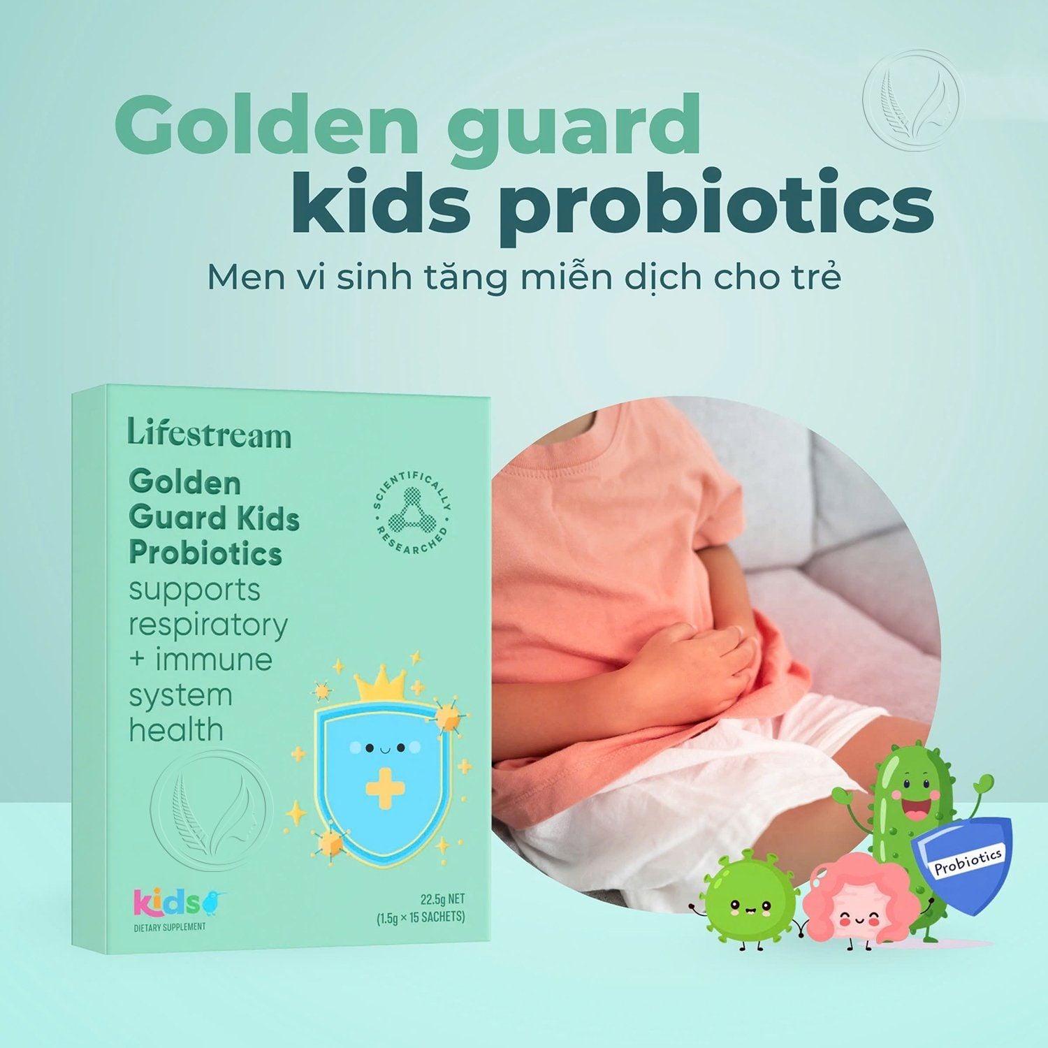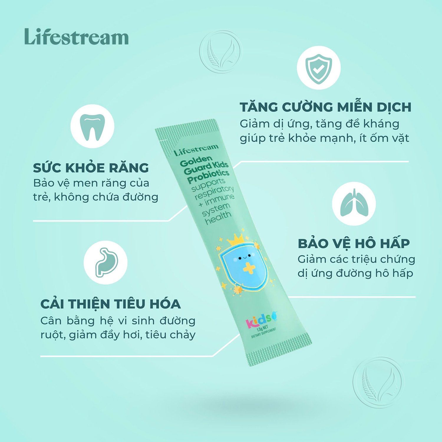Lifestream Golden Guard Kids Probiotics là công thức cao cấp hỗ trợ sức khỏe hệ hô hấp và miễn dịch, đồng thời giúp răng chắc khỏe cho trẻ. Sản phẩm được phát triển dựa trên việc lựa chọn năm loại men vi sinh có hoạt tính cao từ 2000 chủng vi khuẩn, tuân thủ các tiêu chuẩn khoa học nghiêm ngặt, kết hợp cùng Epicor men vi sinh hậu sinh học được chiết xuất từ công nghệ lên men 75% của Mỹ và tinh chất kiwi vàng New Zealand. Nhờ đó, sản phẩm tạo ra một hàng rào bảo vệ tự nhiên trên niêm mạc đường hô hấp và ruột của bé, ngăn chặn các phản ứng dị ứng dây chuyền như dị ứng mũi hay dị ứng đường ruột.