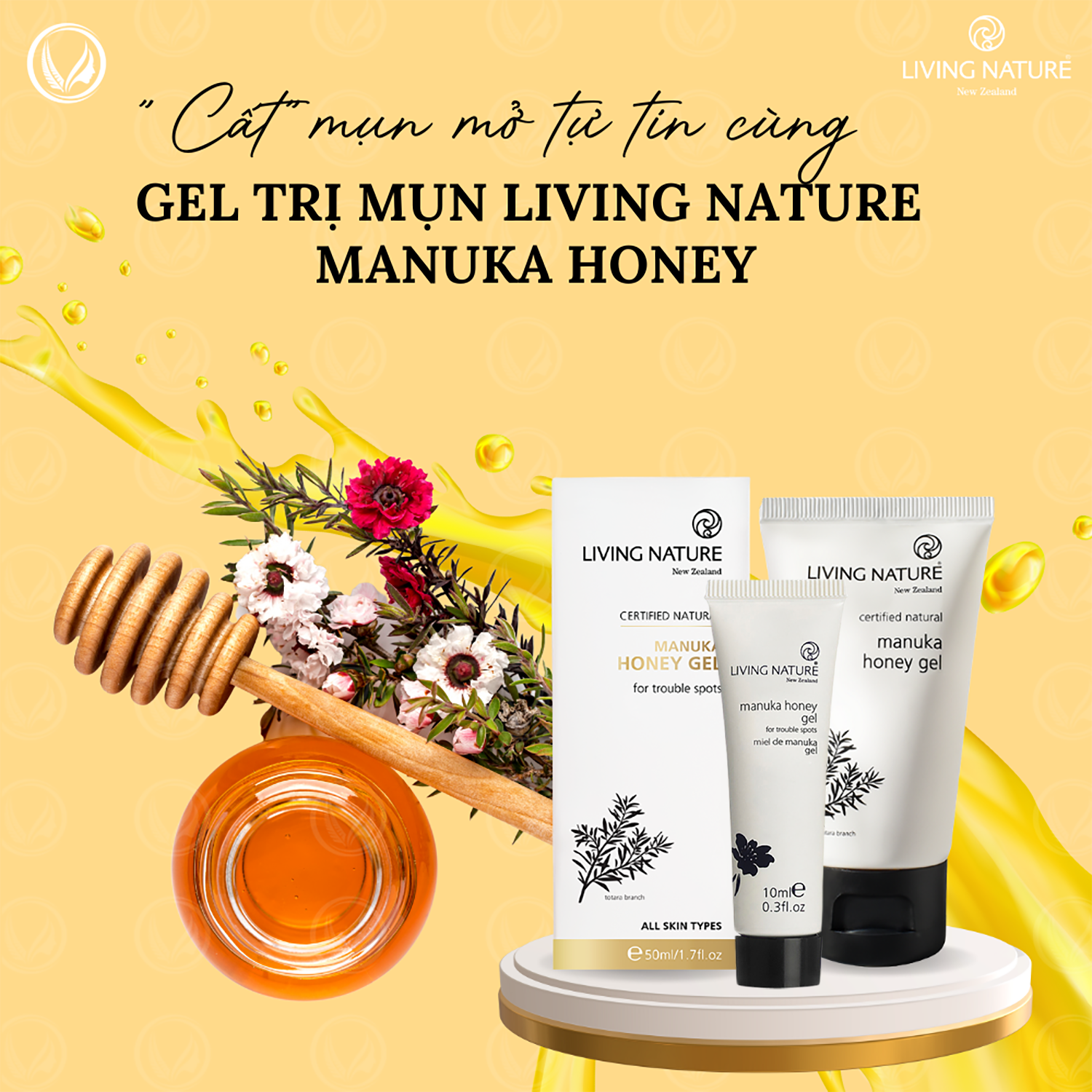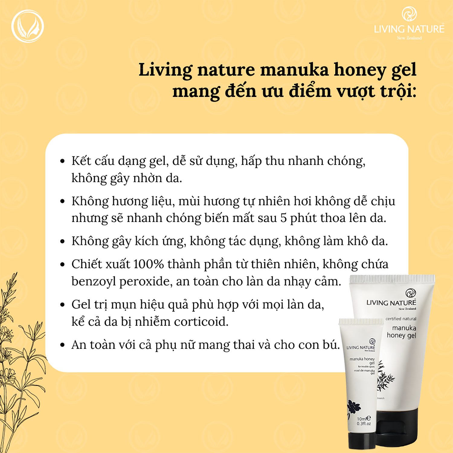 - Gel trị mụn Living Nature Manuka Honey Gel không chỉ hiệu quả trong điều trị mụn mà còn giúp phục hồi sức khỏe làn da.