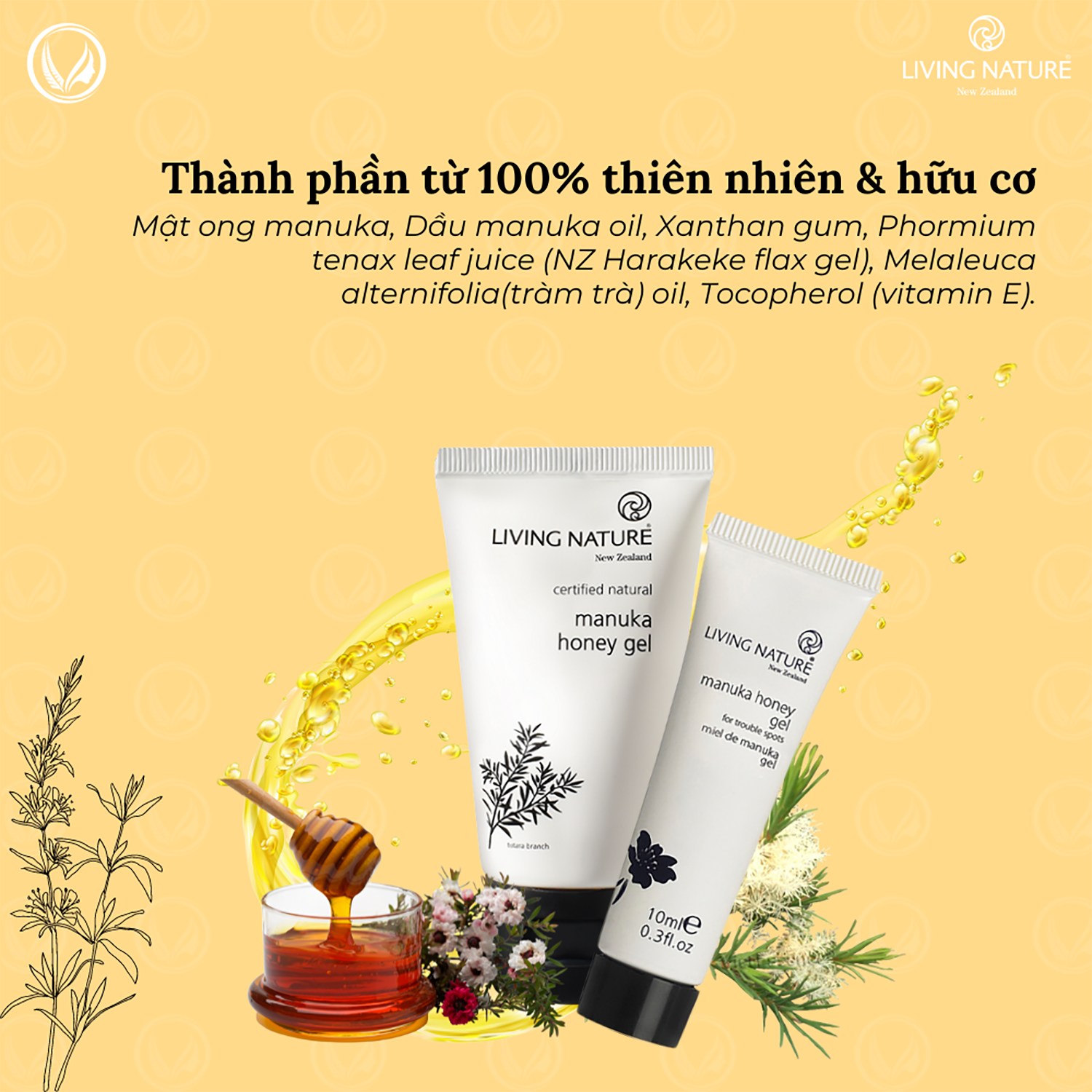 Living Nature Manuka Honey Gel kết hợp với tác dụng trị mụn hiệu quả là các lợi ích nuôi dưỡng, dưỡng ẩm, bảo vệ và phục hồi da nhờ tác dụng tuyệt vời của 3 thành phần chính: dầu manuka và mật ong manuka hoạt tính, gel lanh harakeke.