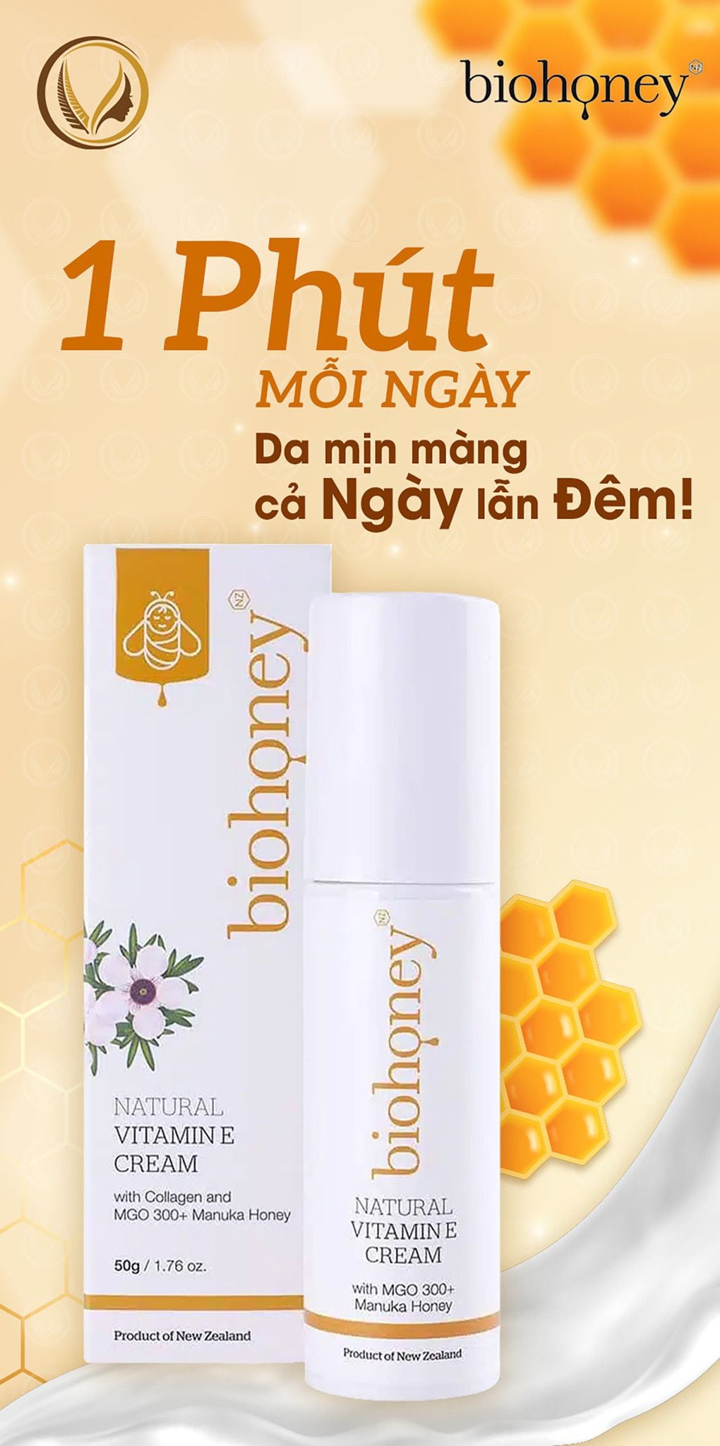 Biohoney Natural Vitamin E Cream giàu Vitamin E và Collagen, dễ dàng thẩm thấu vào da, giúp phục hồi độ ẩm và nuôi dưỡng làn da từ sâu bên trong. Công thức đặc biệt kết hợp mật ong Mānuka với nồng độ MGO300+, dầu bơ, dầu hạt mơ, và dầu hoa anh thảo mang lại làn da mềm mịn, khỏe mạnh, và trẻ trung.