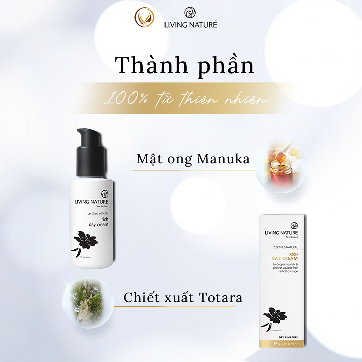 Living Nature Rich Day Cream được bào chế phù hợp cho da khô, da lão hóa, kem dưỡng ẩm ban ngày Living Nature Rich Day Cream lợi ích bảo vệ và nuôi dưỡng mạnh mẽ. Bảng thành phần có chứa dầu bơ, dầu macademia, bơ hạt mỡ và mật ong Manuka, tất cả đều có tính bổ dưỡng và tinh khiết. Ngoài ra, nó cũng chứa thành phần ngăn ngừa sự hình thành nếp nhăn và các dấu hiệu lão hóa da.