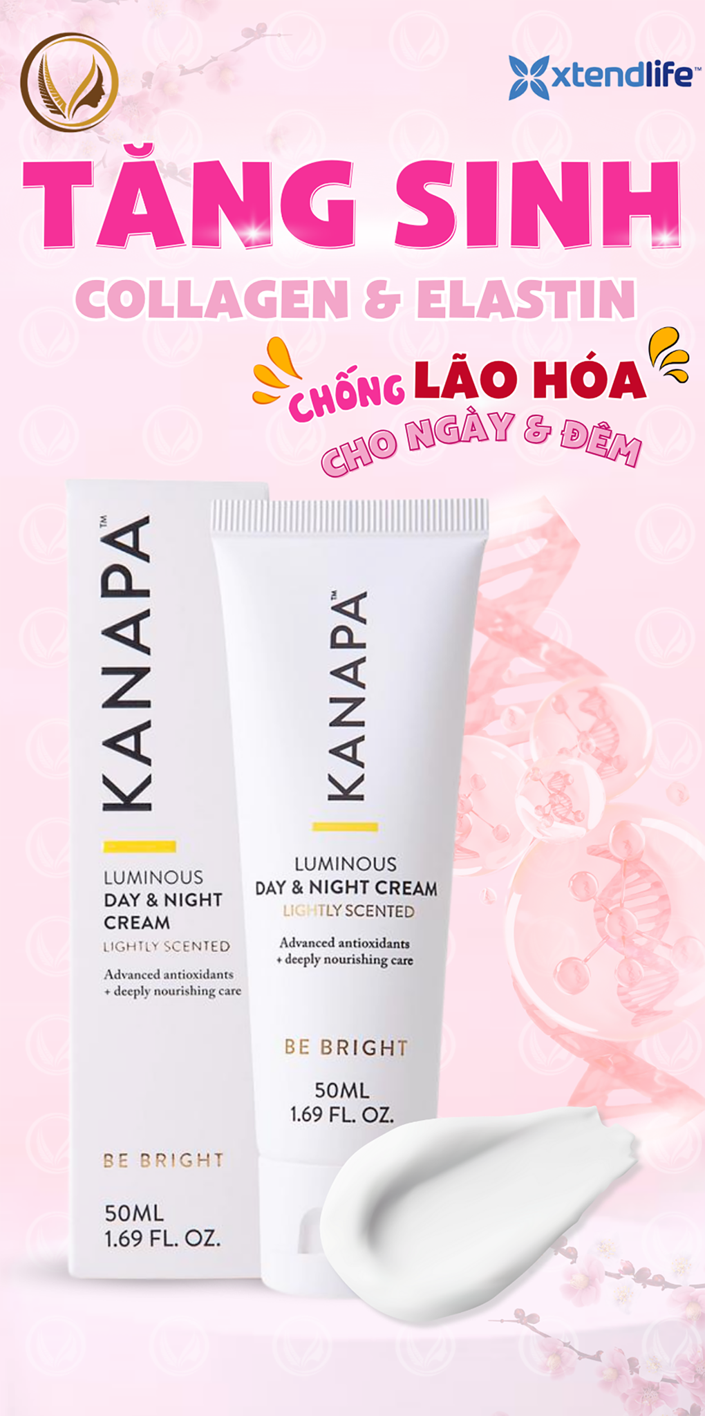 Xtend Life Kanapa Luminous Day & Night Cream tăng sinh collagen và elastin thúc đẩy làn da tươi sáng, rạng rỡ, chống lão hóa và bảo vệ da khỏi bị kích ứng.