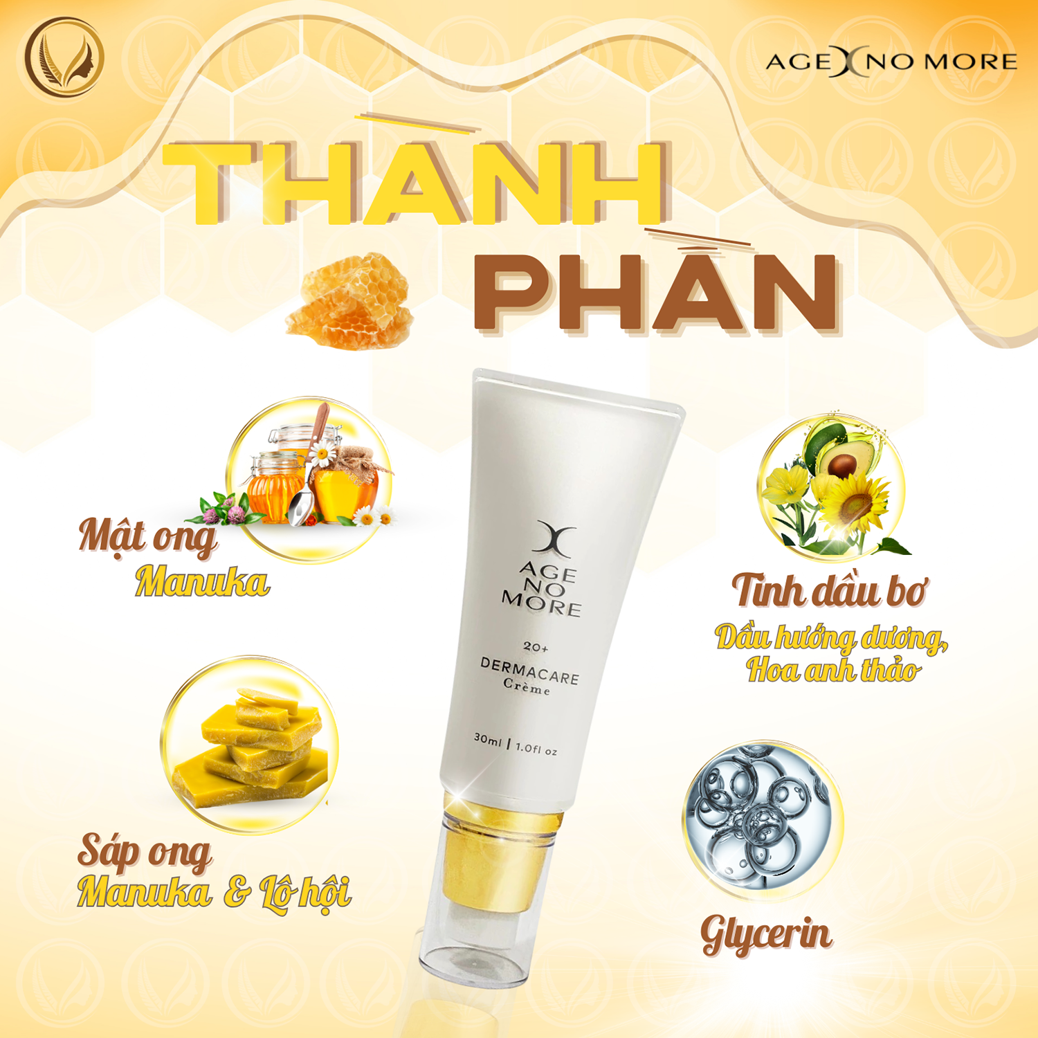 Age No More Dermacare Creme là sản phẩm kem phục hồi da, tận dụng sức mạnh tự nhiên từ mật ong Manuka (UMF+) New Zealand. Công thức độc đáo của sản phẩm kết hợp các thành phần hoạt tính nổi bật như mật ong Manuka hoạt tính, dầu quả bơ, chiết xuất nha đam, Cetearyl Olivate, glycerin,… giúp mang lại nhiều lợi ích cho làn da: