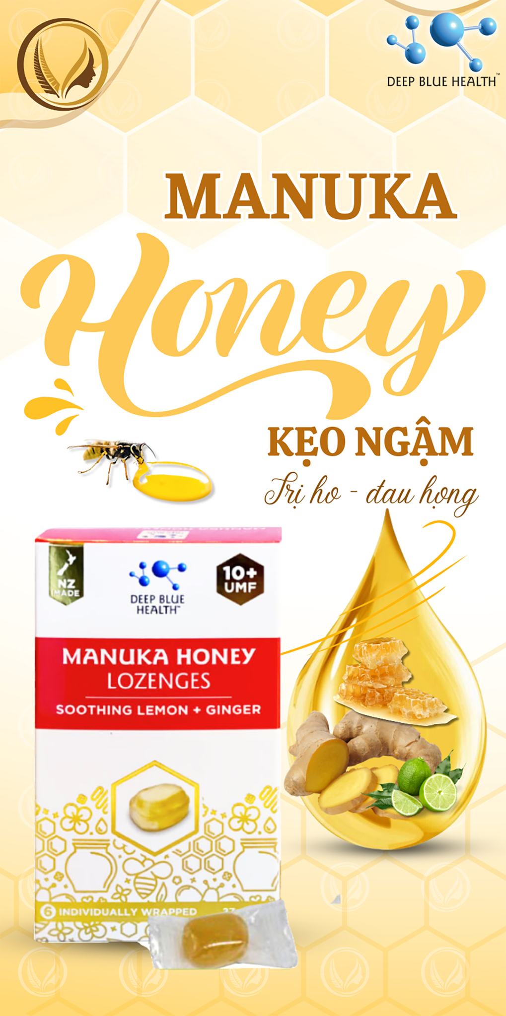 Deep Blue Health Manuka Honey Lozenges được đặc chế để kết hợp những lợi ích từ mật ong Manuka New Zealand mang lại cùng với hương vị tự nhiên của chanh & gừng. Đặc biệt, gừng có rất nhiều công dụng hữu hiệu giúp thông họng, kháng khuẩn, tăng cường miễn dịch đường hô hấp và giảm ho.