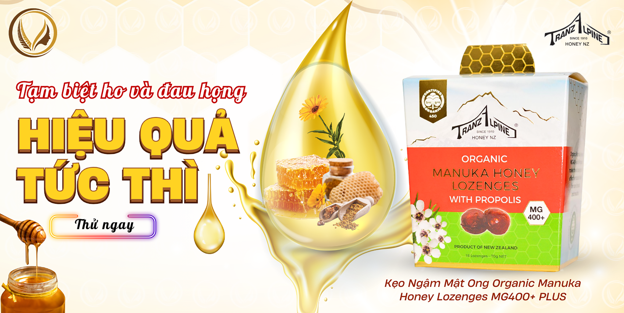 - Mật ong Manuka (MG400+): Kháng khuẩn và kháng viêm mạnh mẽ, giúp giảm đau họng và hỗ trợ quá trình chữa lành nhờ khả năng tiêu diệt vi khuẩn liên cầu.