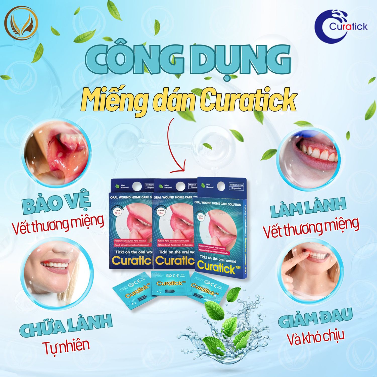 Curatick Tick! On The Oral Wound là một sản phẩm y tế dành cho việc chăm sóc và bảo vệ các vết thương trong khoang miệng. Việc có một lớp bảo vệ vật lý giữa vùng thương tổn và các tác nhân bên trong miệng có thể là một phần quan trọng để ngăn ngừa nhiễm khuẩn và giúp vết thương lành mạnh hơn. Sản phẩm này có thể rất hữu ích trong nhiều trường hợp, như vết loét do cắn phải, tác động nhiệt trong người, trường hợp tay chân miệng ở trẻ em, và ngay cả khi đeo răng giả hoặc niềng răng không vừa vặn.