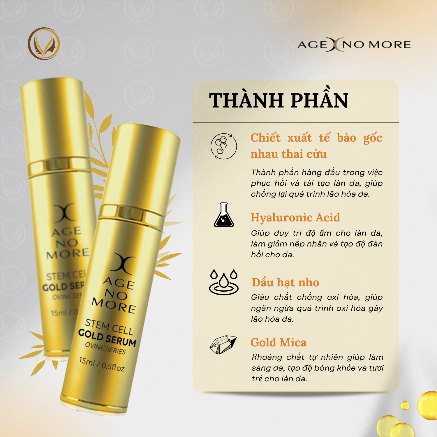 - Bảng thành phần đầy đủ: Chiết xuất tế bào gốc nhau thai cừu AGE NO MORE, axit hyaluronic, dầu hạt nho, vàng Mica, Lubrajel MS, Glycerin.