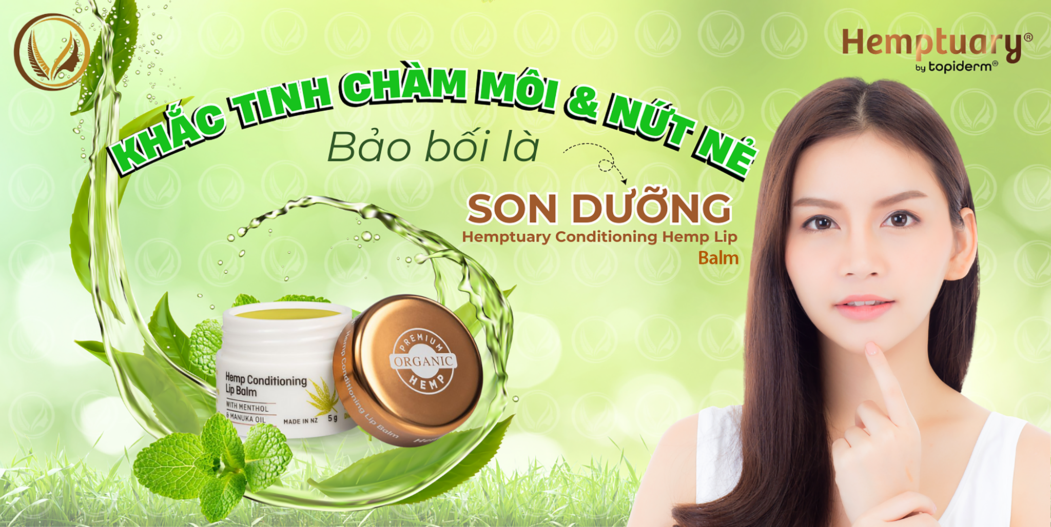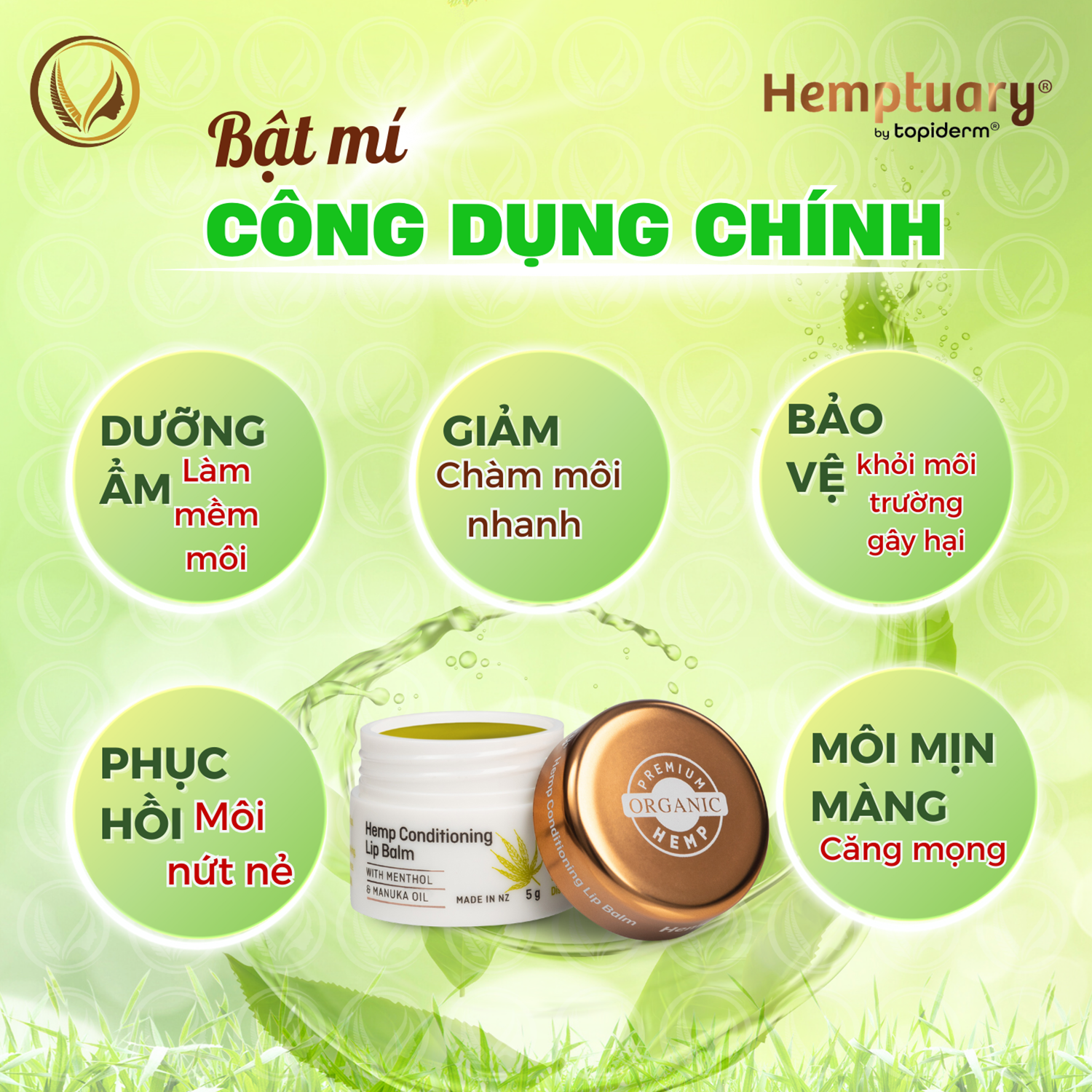 - Làm dịu và phục hồi: Đặc biệt hiệu quả trong việc làm dịu và chữa lành các vết nứt, chàm môi nhờ sự kết hợp của dầu hạt cây gai dầu (Hemp Seed Oil), sả, và bạch đàn.