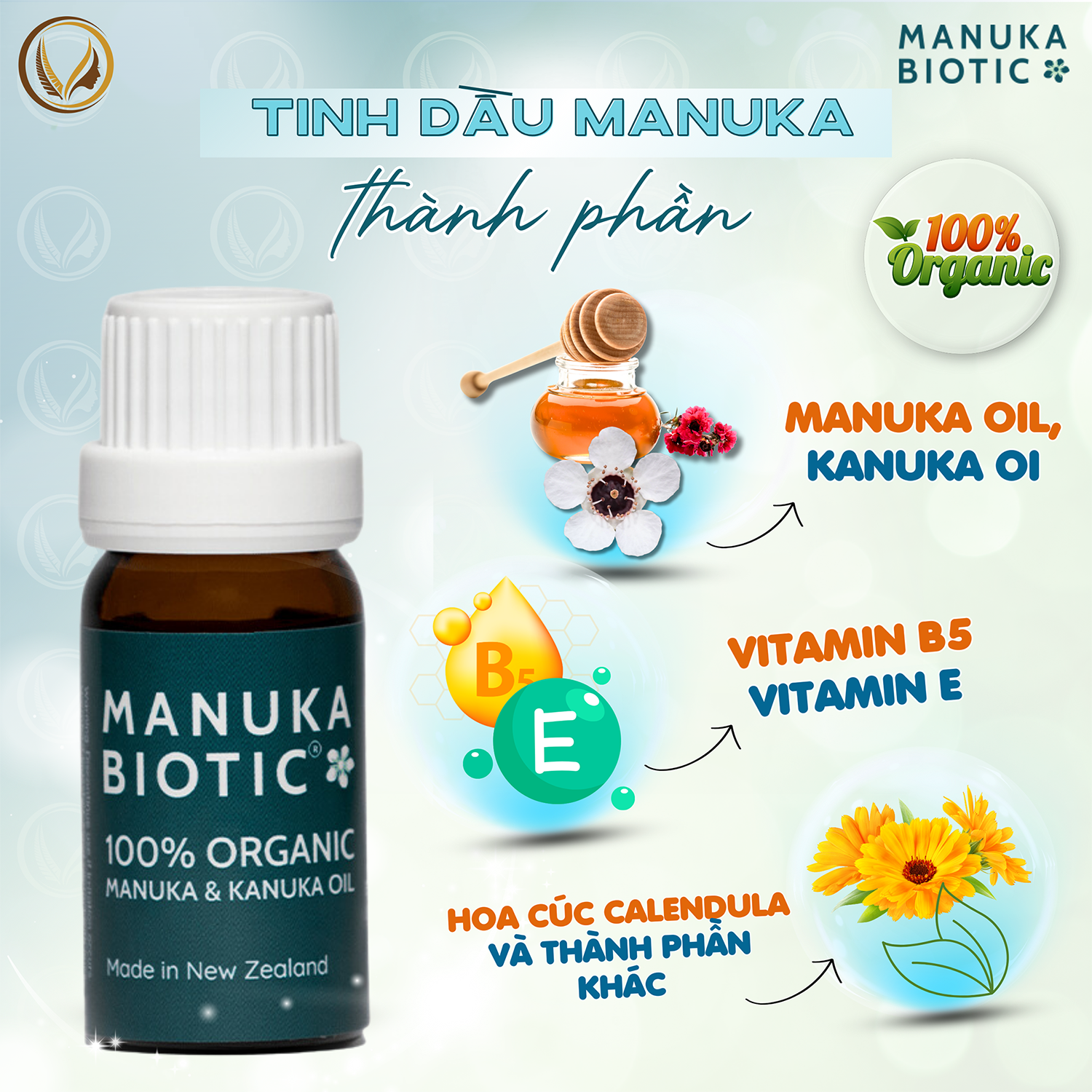 Manuka Biotic Certified Organic Manuka Oil một loại cây bản địa của New Zealand. Từ lá, cành và hoa của cây Manuka, chúng ta có được loại tinh dầu chứa các hợp chất hoạt động mạnh mẽ, trong đó có các phenol và flavonoid. Chính những hợp chất này tạo nên tính kháng khuẩn, kháng viêm và kháng nấm đặc biệt của dầu Manuka.