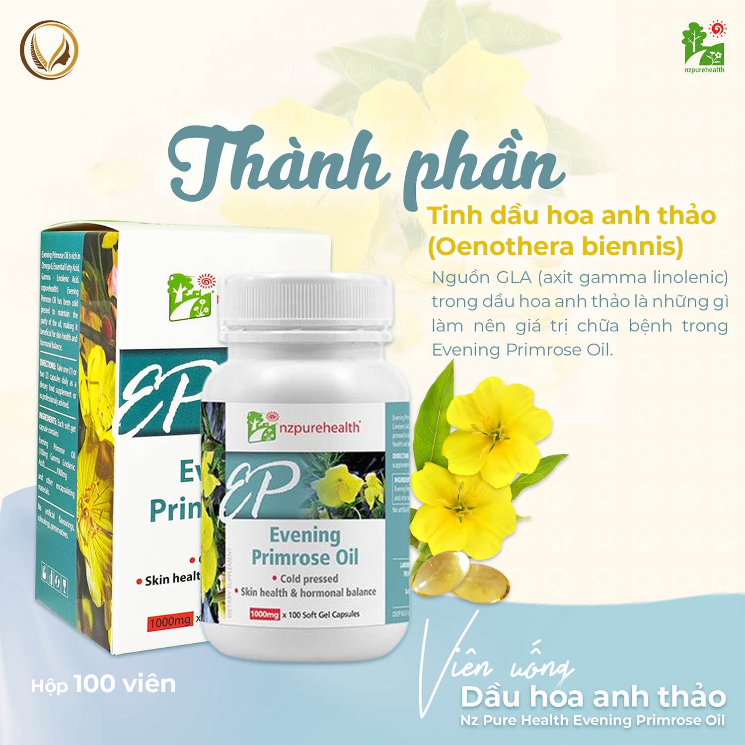 Nz Pure Health Evening Primrose Oil được chiết xuất từ hoa anh thảo (Oenothera biennis), một loài hoa dại được tìm thấy ở Bắc Mỹ, Châu Âu và một phần của châu Á. Hoa Anh Thảo có màu vàng nhạt, nở vào buổi tối và các hạt giống của nó có tinh dầu đặc biệt được sử dụng trong việc cải thiện sức khỏe. Nguồn GLA (axit gamma linolenic) trong dầu hoa anh thảo là thành phần có trong Evening Primrose Oil. Cơ thể chuyển đổi GLA thành prostaglandin, các hoocmon này như các hợp chất giúp điều chỉnh các chức năng của cơ thể, kiểm soát viêm trong một số trường hợp. Axit này có tác dụng làm cân bằng các hoocmon sinh sản của người phụ nữ, giúp giữ gìn và cải thiện tình trạng của da, tóc và móng, phù hợp cho những người ăn kiêng…