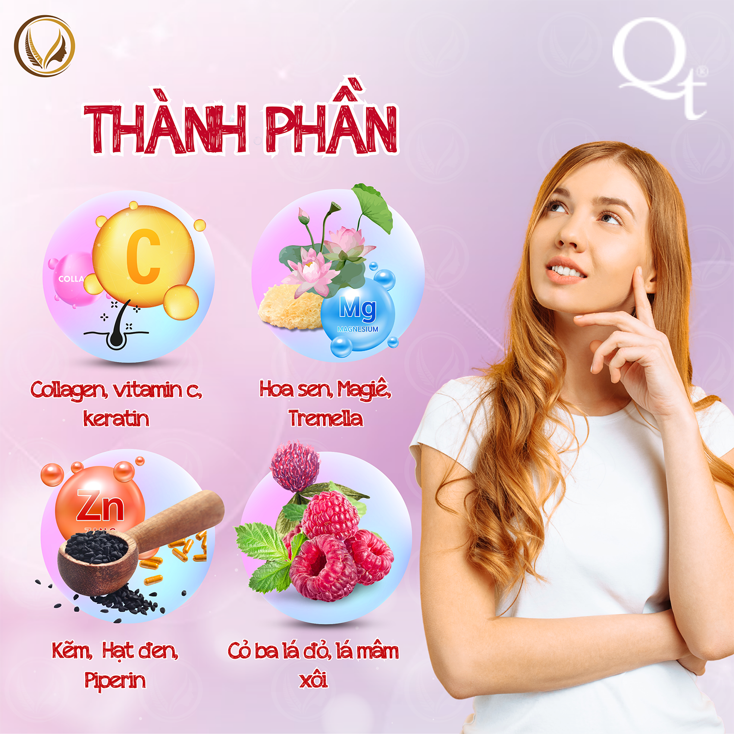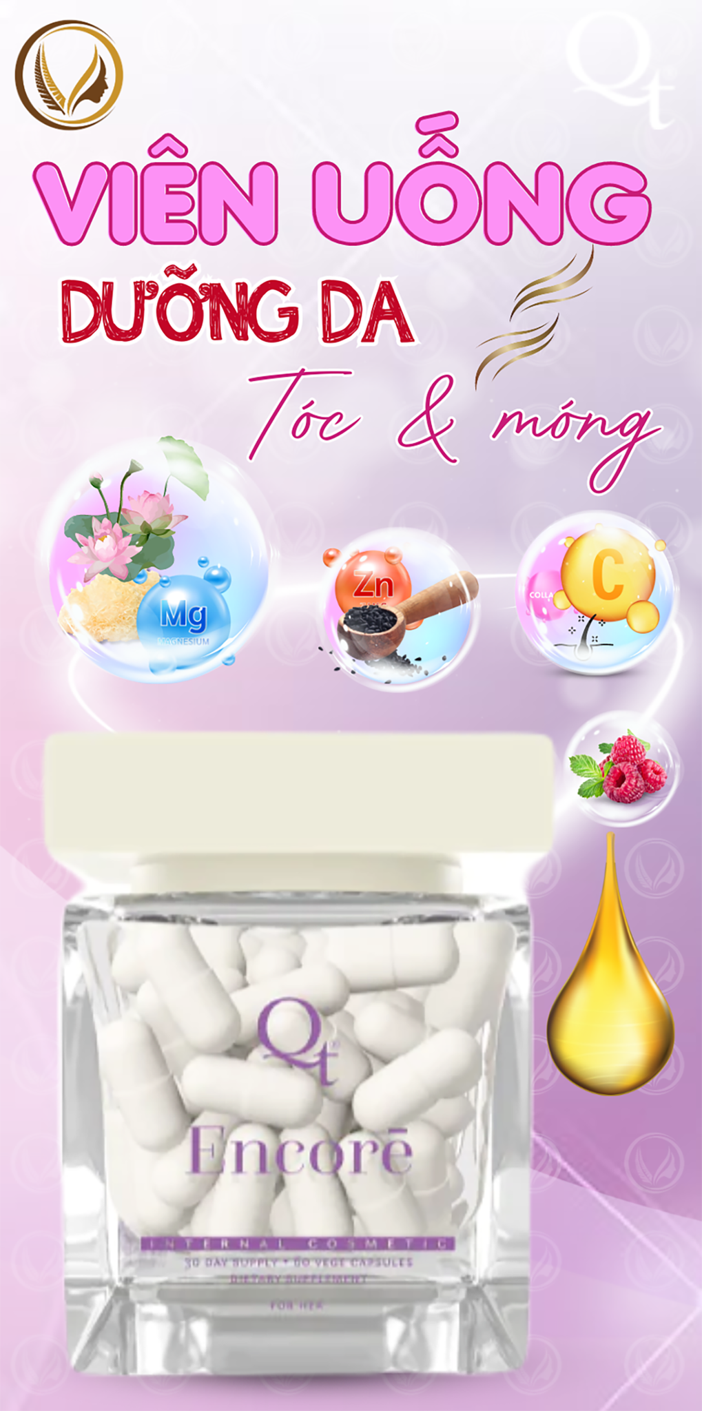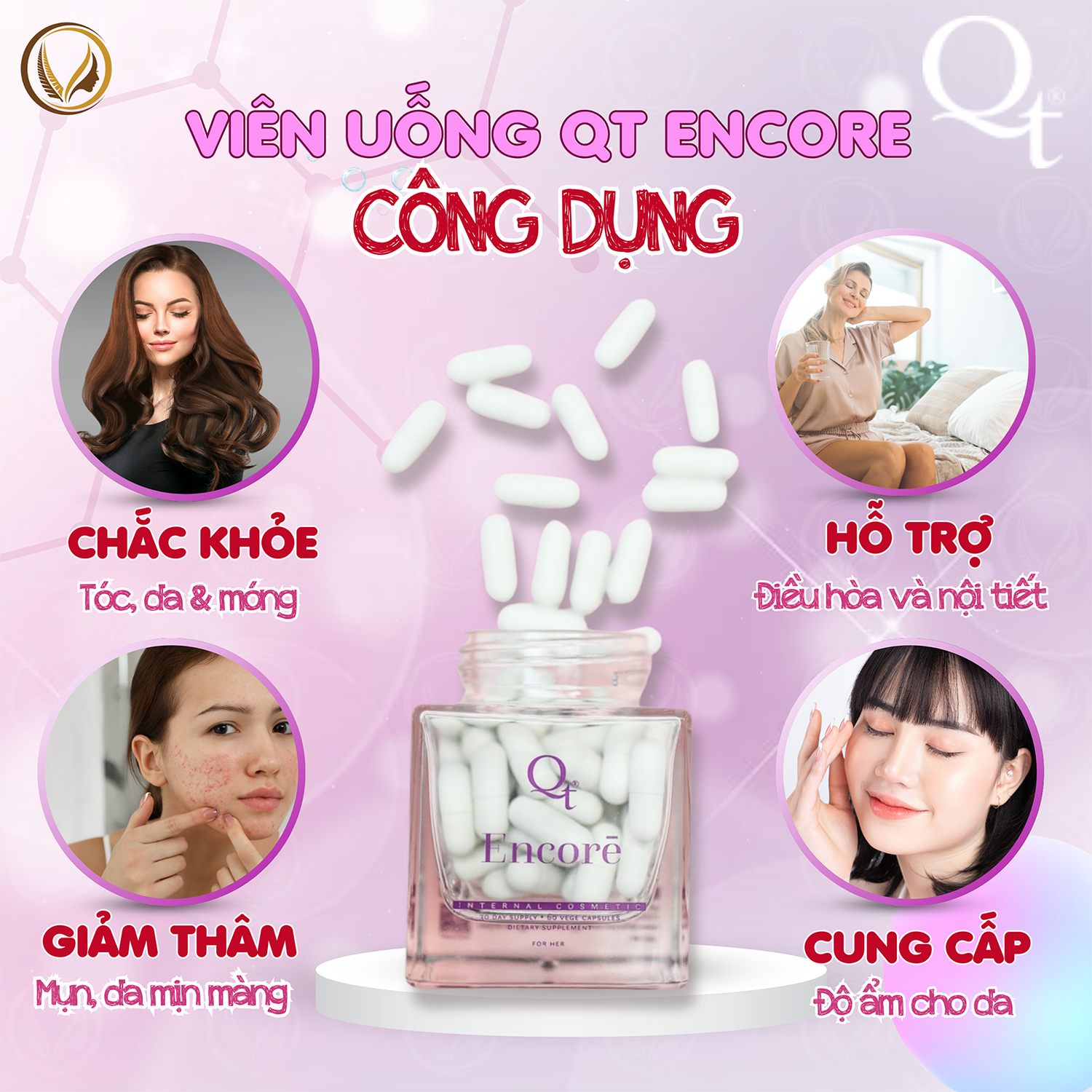 Với sự kết hợp độc đáo của các thành phần hoàn toàn tự nhiên, QT Encore là sự bổ sung hiệu quả và tiện lợi cho việc chăm sóc sức khỏe và sắc đẹp của bạn. Không chỉ giúp làm mờ nếp nhăn, mà còn giúp tóc và móng chắc khỏe, đồng thời giảm thiểu các vấn đề về mụn và cân bằng hormone.