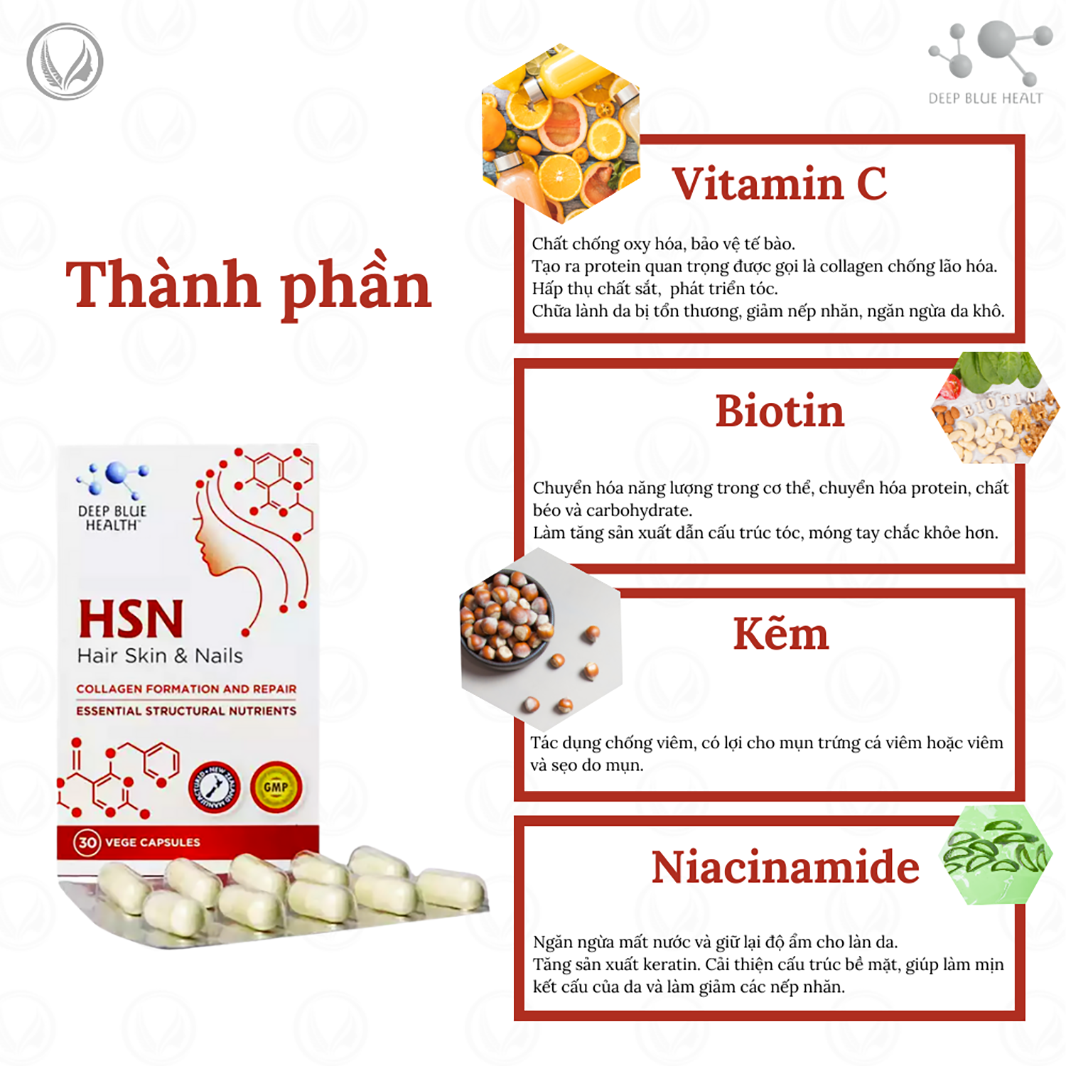 Deep Blue Health HSN Hair Skin & Nails được phát triển đặc biệt để cung cấp các dưỡng chất thiết yếu cho quá trình hình thành và phục hồi collagen. Sản phẩm này lý tưởng cho những ai gặp phải tình trạng da khô, thô ráp, lão hóa sớm, hay tóc xỉn màu và móng tay yếu. Với sự kết hợp hoàn hảo của Vitamin C, Kẽm, Biotin và Selen. Không chỉ giúp cải thiện sức khỏe tổng thể của làn da mà còn tăng cường sự khỏe mạnh cho tóc, mang lại mái tóc dày, bóng khỏe và dẻo dai hơn. Công thức độc đáo và hoàn hảo cho bất cứ ai đang bị các tình trạng như: