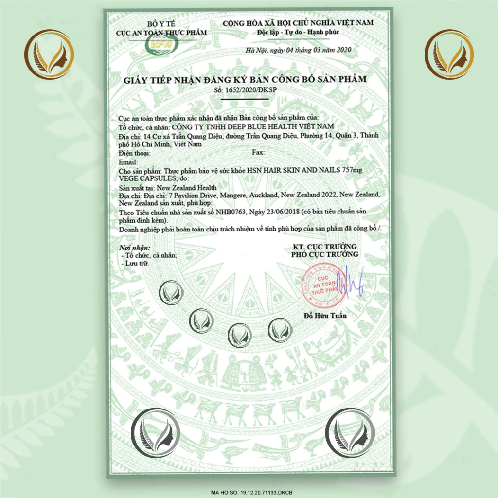 Deep Blue Health HSN Hair Skin & Nails được kiểm tra chất lượng phòng thí nghiệm của New Zealand. Được sản xuất theo nguyên tắc HACCP được quốc tế công nhận và đạt tiêu chuẩn GMP.