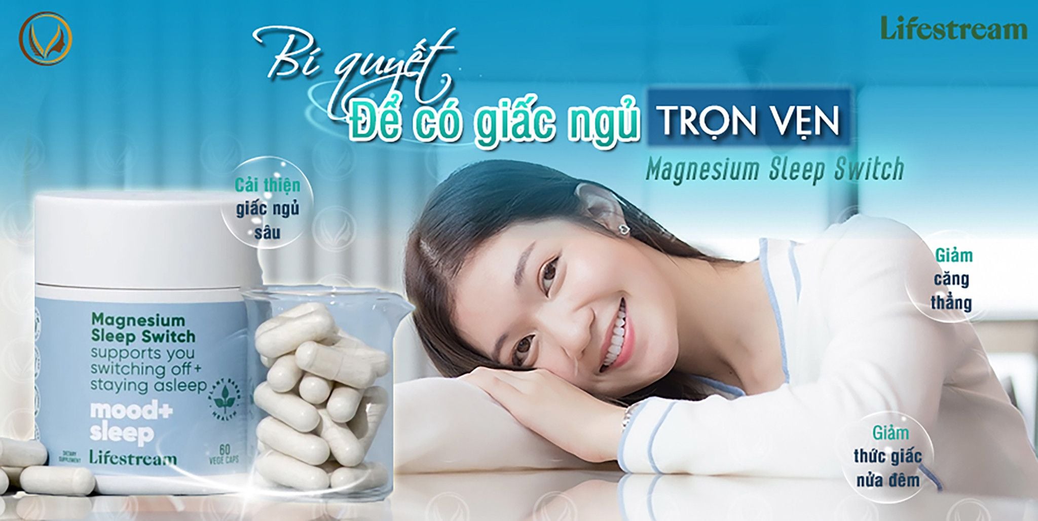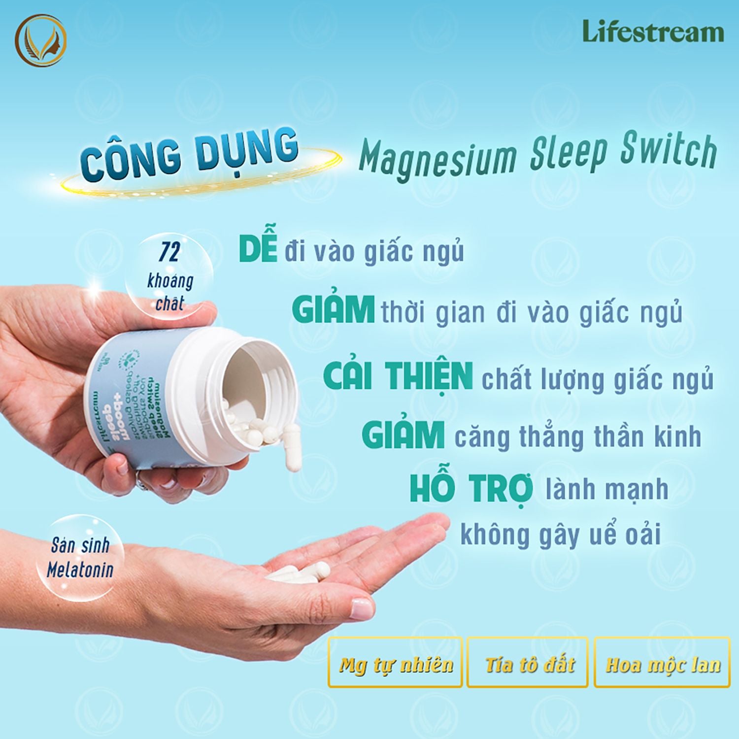 - Lifestream Magnesium Sleep Switch với công thức độc đáo không gây buồn ngủ, được phát triển để giúp hỗ trợ giấc ngủ phục hồi sâu, giúp thúc đẩy hình thành giấc ngủ lành mạnh với hiệu ứng tỉnh táo sau khi thức dậy.