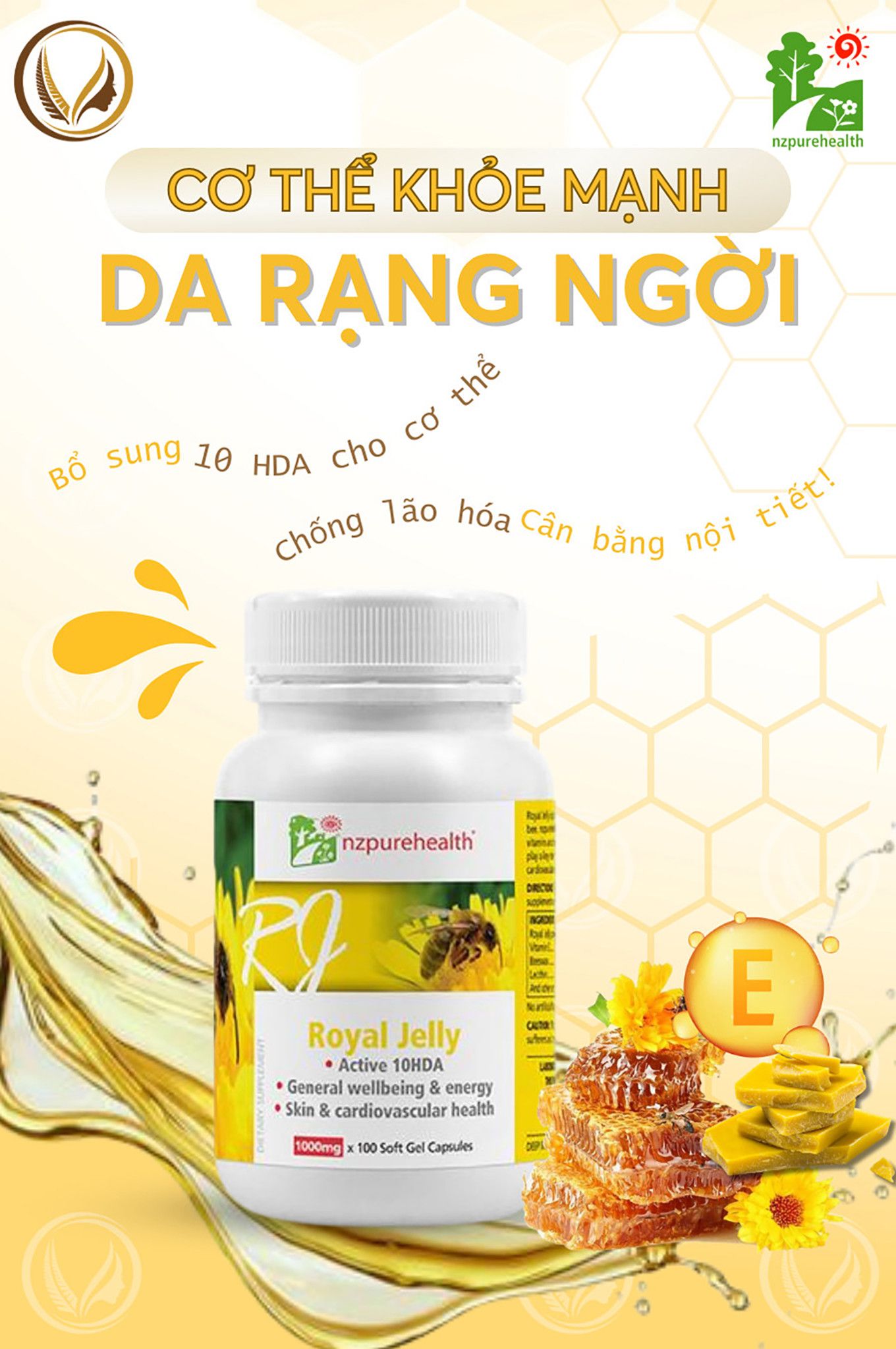 NZ Pure Health Royal Jelly cung cấp dinh dưỡng, giúp bổ sung dinh dưỡng cho cơ thể, tăng cường trao đổi chất và tăng cường hệ miễn dịch, chống lão hóa, giảm thâm nám, đồi mồi, tàn nhang, giúp da trắng hồng, mịn màng và tươi trẻ.