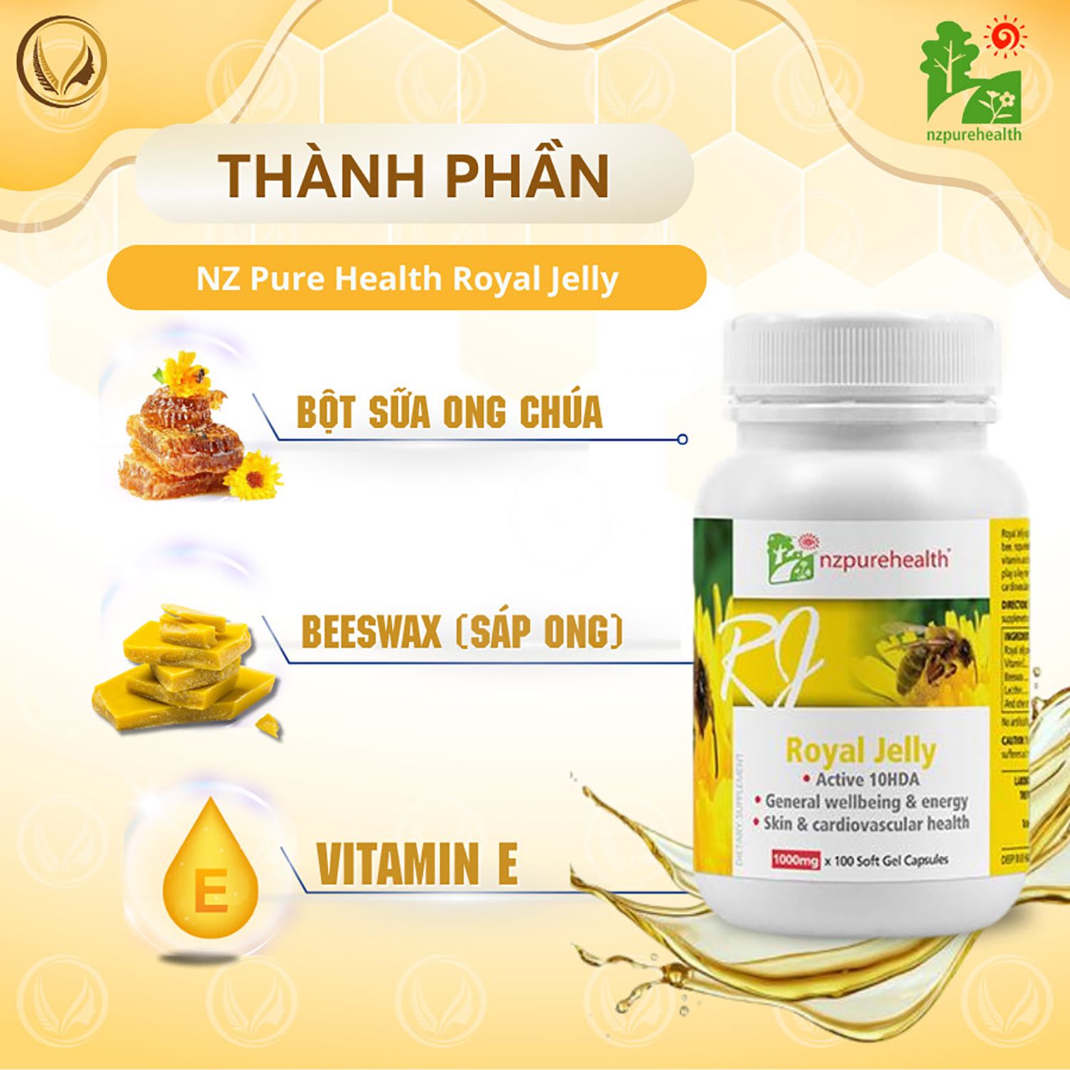 Mỗi viên nang NZ Pure Health Royal Jelly chứa:- Royal Jelly as equivalent to (6% Active 10 HDA):1000mg