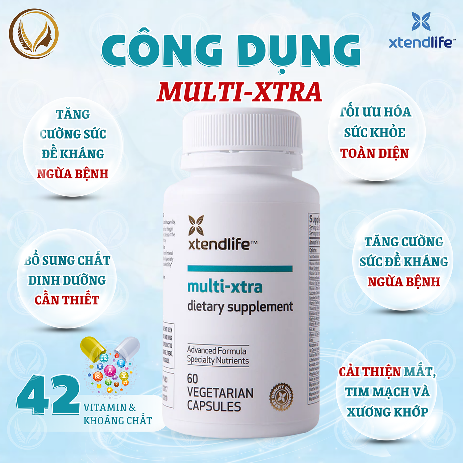 - Multi-Xtra chứa 42 chất dinh dưỡng sinh học khả dụng, sẵn sàng để nâng cao sức khỏe tế bào của bạn! Khác với các loại vitamin tổng hợp thông thường, Multi-Xtra cung cấp nhiều hơn chỉ là một hỗn hợp vitamin và khoáng chất cơ bản. Đồng thời, Multi-Xtra còn chứa các yếu tố quan trọng giúp cơ thể hấp thụ tối ưu các chất dinh dưỡng, như Piperine giúp cải thiện khả năng sinh học của các chất dinh dưỡng. Vì vậy, cơ thể bạn sẽ hấp thụ các chất dinh dưỡng một cách hiệu quả.